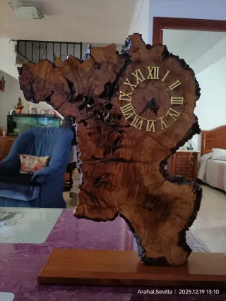 Original reloj decorativo con un diseño único tallado en madera. - Pieza de madera con acabado natural. - Detalles en metal dorado para las horas. - Base de madera para su soporte.