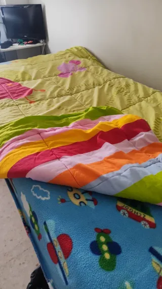Nórdico infantil con un diseño reversible. - Un lado es de color verde con dos dibujos - El otro lado es de color verde con un estampado de líneas.