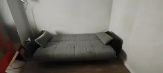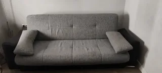 Sofá cama Tiene tres años. Vendemos por cambio de sofá. El precio es bajo porque por detrás tiene un agujero el cual no se ve cuando estás sentado ni cuando es sofá cama. Tiene para guardar cosas debajo Habría que venir a recogerlo. - Tapicería de tela. - Combinación de colores gris y negro.