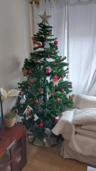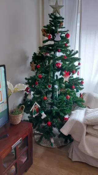 Árbol de Navidad de altura 180cm. Solo lleva 2 navidades, esta muy bien. Lo vendemos porque se nos queda pequeño en nuestra nueva casa, que es más grande y con techos mas altos.