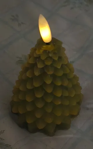 Vela led de plástico y cera con forma de árbol de Navidad. - Efecto llama/centelleante. - Temporizador de 6 horas encendido / 18 horas apagado. - Luz amarilla cálida. - Incluye mando a distancia