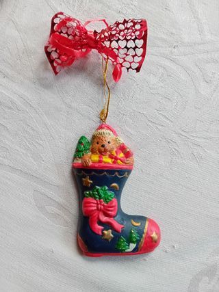 Dos adornos de cerámica de navidad para el árbol, ventanas, puertas u otros lugares donde decorar tu casa para esta festividad. Bota: 11cm de alto Casita: 8,5cm de alto Se regalan dos bolsitas navideñas para guardarlos. Se hacen envíos.