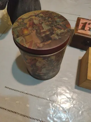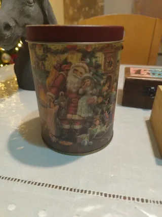 Conjunto de un bote metálico con diseño navideño y dos cajas de madera. - Bote con ilustración de Papá Noel y árbol de Navidad. - Cajas de madera con detalles decorativos.estan en condiciones aceptables la caja que pone uno para mí está escrita en la base