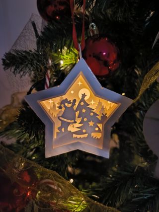 Caja de luz en forma de estrella hecha en papel de alto grosor con decoración navideña lleva se puede elegir con luz led o ponerlas con las bombillas del árbol. No apta para exterior ya que es de papel. los dos tonos diferentes no es por la bombilla es por el tono del papel. Si necesita más información no dude en preguntar. tags: regalo, navidad, decoración, navideño, estrella, árbol, papá Noel, reyes, detalle, bonito, lámpara, luz, decoración, original, familia, amigo invisible, papel.