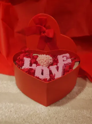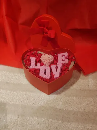 Conjunto de velas artesanales con la palabra LOVE y un corazón decorativo, presentadas en una caja.Regalo ideal para regalar a tu enamorada/o, para San Valentín 💘💘 - Velas con letras realizadas de forma artesanal con cera de soja natural "LOVE ♥️" - Detalle de corazón central. - Caja con forma de corazón.