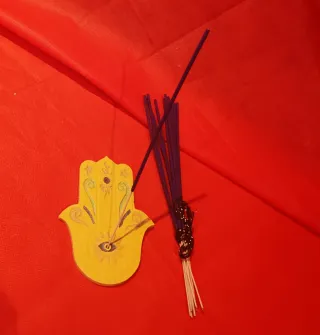 Set de soporte para incienso con forma de mano de Fátima e incienso de lavanda - Soporte de madera pintado a mano. - Incluye varias velas aromáticas de color morado.