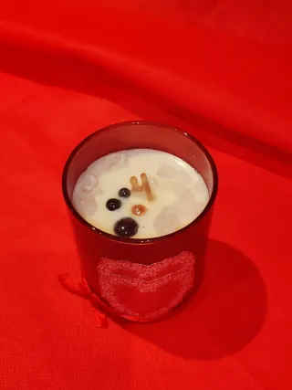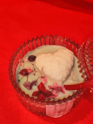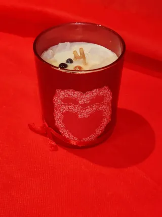 Preciosa vela artesanal con un diseño único. - Corazón de cera blanco. - Decorada con flores secas en tonos rojos y morados. - Envase de cristal con detalles. - Lazo rojo decorativo.