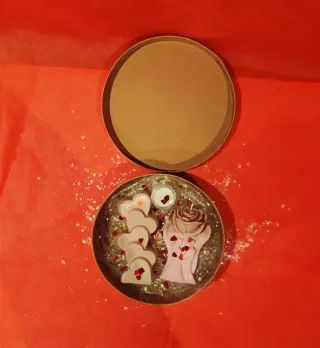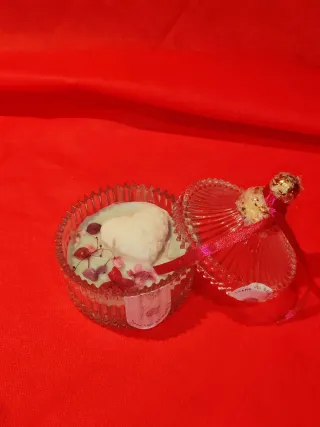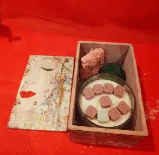 Set de velas artesanales con fragancias que evocando el AMOR del día de San Valentín ♥️ ♥️ -Realizadas con cera de soja natural. -Caja de madera decorada de forma artesanal con decoupage, stencil y pintura a mano alzada. - Vela principal en recipiente de cristal. - Adornos decorativos en forma de flor y figura. - Envase de cristal con letras "AMOR y LOVE" 💘 ✨