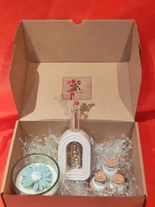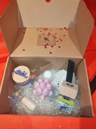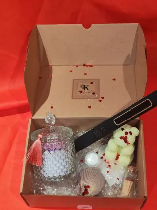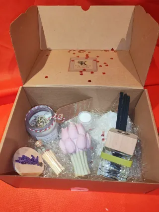 Este set incluye varias velas artesanales con fragancias únicas y cera de soja natural. - Vela en tarro de cristal con tapa. - Set de tulipas de jabón rosa. - Difusor de ambiente con varillas. - Pequeño tarro con tapa. - Objeto decorativo de madera con lavanda. - Cerillas en un frasco de cristal.