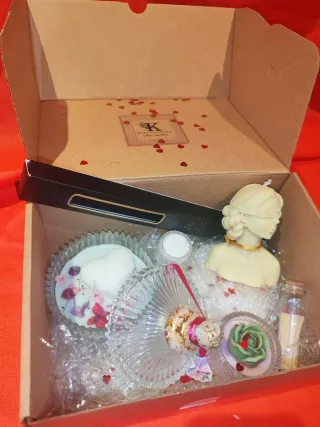 Conjunto de velas artesanales con fragancias y cera natural. - Vela con forma de busto. - Vela con forma de corazón y pétalos. - Vela con forma de rosa. - Pequeño frasco con material aromático.