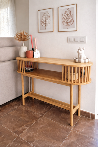 Elegante recibidor de Sklum con un diseño moderno y funcional. Aporta un toque natural a tu entrada. - Fabricado en madera y bambú. - Color beige y marrón. - Diseño con listones.