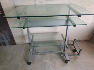 Mesa de ordenador con un diseño moderno y funcional. - Estructura de metal plateado. - Superficies de cristal. - Ruedas para facilitar su movilidad.