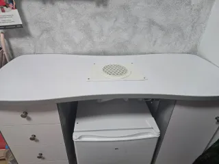 Mesa de manicura con un diseño curvo y elegante, ideal para tu espacio de trabajo. - Incorpora un aspirador de polvo integrado. - Dispone de cajones para almacenamiento. -regalo algunas cositas