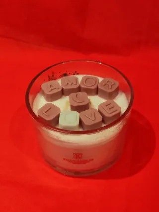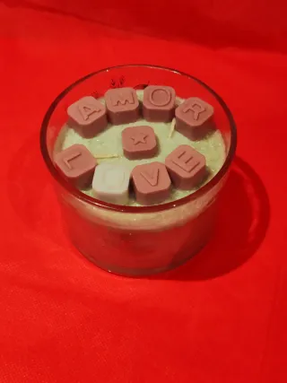 Velas artesanales con un diseño único y fragancia agradable. - Corazón rosa central. - Letras decorativas con la palabra LOVE YOU. Personaliza tu vela con las frases que desee. - Adornos dorados alrededor.