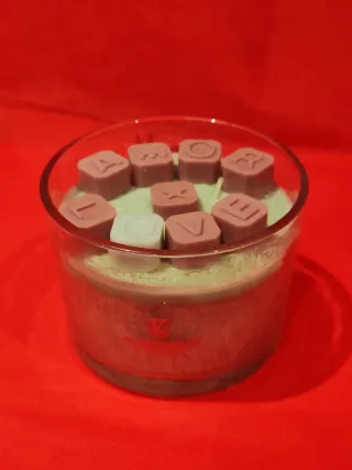 Vela artesanal con un diseño único, fondo de cera verde esperanza y letras en rosa 🌹 "AMOR" "LOVE" - Cubos con letras AMOR y una estrella. - Vela en recipiente de cristal.