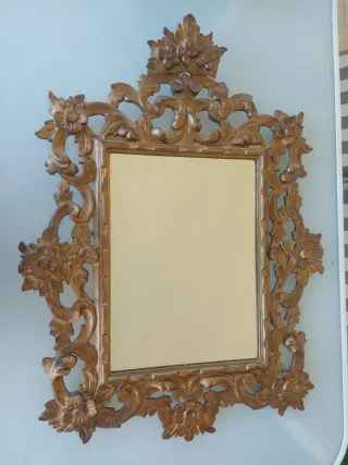 Espejo con marco de madera tallada y acabado dorado. Sus dimensiones son 79 x 104 cm. - Marco con detalles florales y ornamentales. - Diseño barroco. - Ideal para dar un toque de elegancia a cualquier estancia. - No hago envío