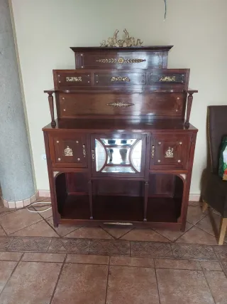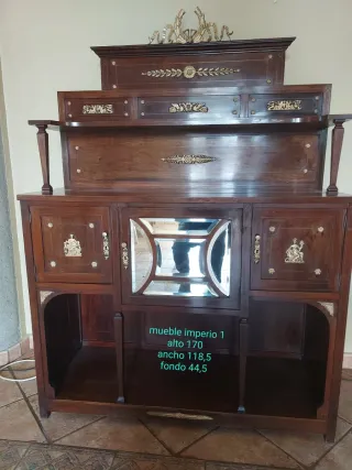 Mueble de estilo Imperio con detalles dorados y acabados en madera. Madera de caoba. - Medidas: alto 170 cm, ancho 118,5 cm, fondo 44,5 cm. - Diseño con puertas, cajones y estantes. - Incorpora un espejo central con marco decorativo. - Ornamentación dorada en puertas y detalles superiores. -No lo envío