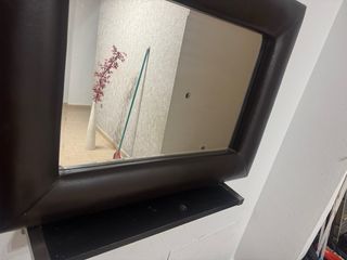 Elegante espejo con un marco que combina cristal y cuero, ideal para dar un toque sofisticado a tu entrada o recibidor. - Marco con detalles en cuero. - Diseño moderno y versátil.