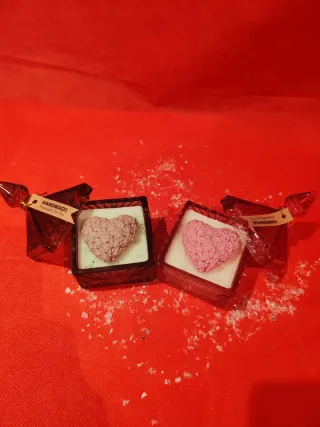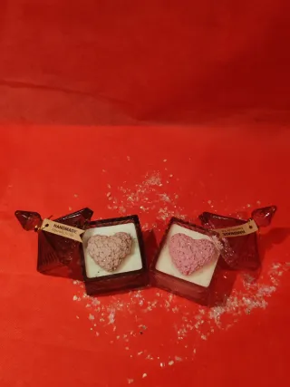 Dos velas artesanales con forma de corazón, perfectas para añadir un toque especial. - Especial para regalar para San Valentín 💘 💘 - Diseño en forma de corazón. - Elaboración artesanal con cera de soja natural.