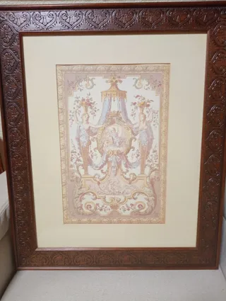 Conjunto de dos cuadros decorativos con un marco de madera tallada. - Diseño clásico con detalles ornamentales. - Tonos beige y marrón que combinan fácilmente. -50 x60 cm -35 x 60 cm