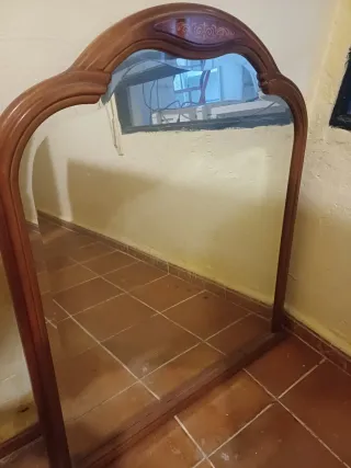 Elegante espejo con un diseño clásico, perfecto para colgar en la pared o colocar sobre un tocador. - Marco de madera con detalles decorativos. - Forma arqueada superior.