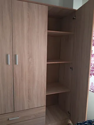 Armario de tres puertas con un diseño moderno y funcional. Sus acabados en madera aportan calidez a cualquier espacio. - Tres puertas de fácil apertura. - Amplio espacio interior. - Tiradores metálicos.