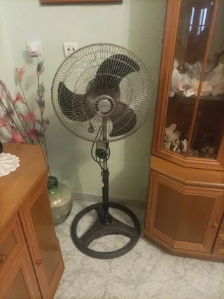 Ventilador de pie con un diseño moderno y funcional. - Altura ajustable. - Base estable para mayor seguridad. - Rejilla protectora. - Motor potente.