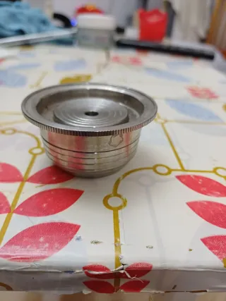 Cápsula de café reutilizable de acero inoxidable. - Compatible con cafeteras Nespresso. - Diseño plateado con acabado metálico. - Incluye filtro.