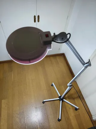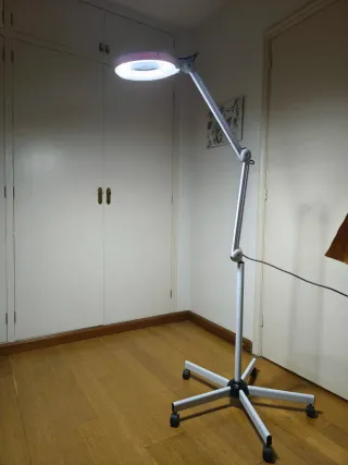 Lámpara de pie con base de ruedas, ideal para estudios o espacios de trabajo. Su diseño permite una fácil movilidad y posicionamiento. - Base con ruedas para desplazamiento. - Brazo articulado para ajustar la altura y el ángulo. - Cabezal con rotación.