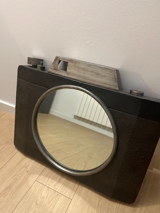 Original espejo decorativo con forma de cámara fotográfica. - Diseño único y llamativo. - Acabado en negro y plateado.