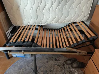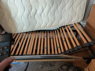 Base de cama articulada con somier de láminas. - Estructura metálica. - Láminas de madera. - Mecanismo eléctrico para ajuste de posición.
