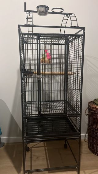 Amplia jaula para loros o aves de tamaño mediano. Cuenta con varios accesorios para el entretenimiento y comodidad de tu mascota. - Incluye palo interior de madera. - Bandeja extraíble para facilitar la limpieza. - Ruedas para un fácil desplazamiento. - Accesorios superiores para juegos y descanso. Dimensiones. 1,5m de alto, 0,5 x 0,5m de base Mejor venta en persona. Recogida en Montcada i Reixac o Arenys de Mar