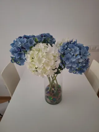 Precioso ramo de hortensias artificiales en tonos azules y blancos, con piedrecitas decorativas. - Flores de plástico de alta calidad. - Base decorada con piedras de colores.