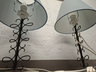 Conjunto de dos lámparas de mesa con un diseño elegante. - Base y estructura de metal. - Pantallas de tela en color azul.