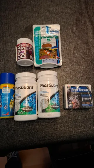 Lote de productos para acuario marino. - - PhosGuard (2 unidades), 1 nuevo y otro a la mitad. - Reef Booster, quedan laa botellas que salen en la foto. - Una botella de SERA AQUATAN acondicionador de agua. - Regalo con el resto de productos Comida Hikari Marine S. Y Coral Dust los dos nuevos a estrenar.