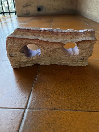 Esta piedra natural es un elemento decorativo perfecto para tu acuario o terrario. Su diseño único con dos aberturas crea un refugio natural para tus peces o reptiles. - Material: Piedra natural. - Dos aberturas para crear escondites. - Aporta un toque natural a tu acuario.