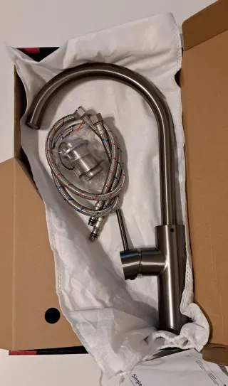 Grifo de cocina monomando Atlantis en acabado gun metal. Su diseño moderno y elegante aportará un toque distintivo a tu cocina. - Grifo de alta calidad. - Acabado gun metal. - Incluye latiguillos de conexión. Nuevo. Precio de tienda: 69 €.