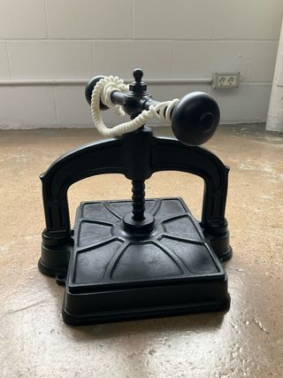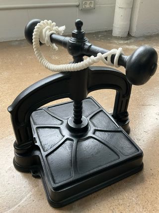 Prensa de libro antigua de metal, ideal para encuadernación o como pieza decorativa. - Construcción robusta en metal. - Diseño clásico y funcional. - Cuerda decorativa incluida.