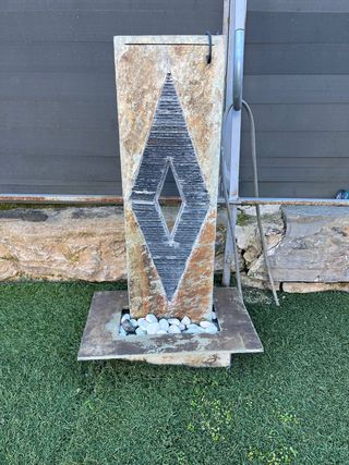 Elegante fuente de cascada de piedra con un diseño moderno. - Panel principal de piedra con detalle en forma de diamante. - Base de piedra con guijarros blancos. - Apta para exteriores.