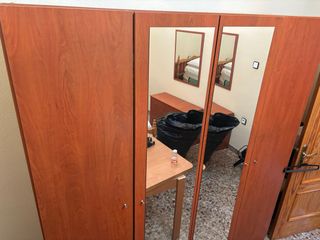 Conjunto de habitación de matrimonio compuesto por: Armario grande con espejo. Dos mesillas. Un espejo de pared. Una cómoda. Un cabecero.