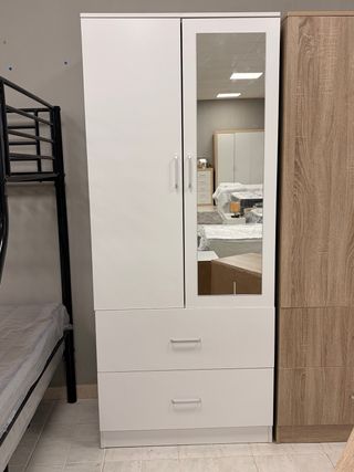 Armario de dos puertas con un diseño moderno. Cuenta con un espejo de cuerpo entero en una de las puertas. - Puertas con tiradores plateados. - Dos cajones inferiores. - Acabado en blanco. - Colores disponibles:Cambria y blanco - Envio a contrareembolso - Producto nuevo - Disponemos de servicio de montaje