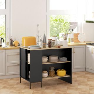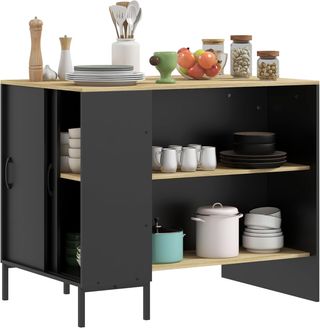 Isla de Cocina Con 2 Estantes Abiertos Y 2 Armarios Con Puertas, Mueble De Cocina en MDF, 105X60X82 Cm, Color Roble Y Negro