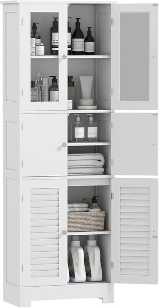 Mueble Columna Baño Con 3 Armarios de 2 Puertas, Mueble Multiusos Con Puertas de Cristal y de Persiana, 60X30X170.5Cm, Blanco