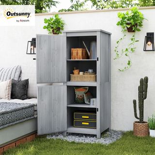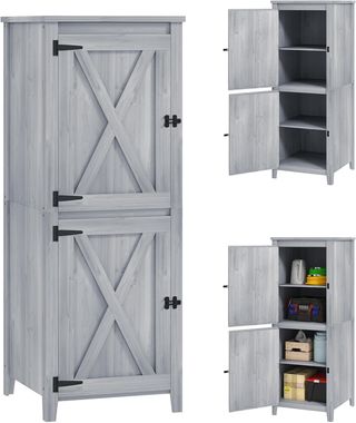 Este cobertizo de jardín de madera de abeto ofrece un armario superior e inferior, perfecto para organizar herramientas y accesorios de exterior. Incluye dos estantes extraíbles para adaptarse a herramientas de varios tamaños. Las dos puertas independientes garantizan un fácil acceso y los pestillos mantienen los objetos seguros. Dimensiones totales: 60L x 60P x 160A cm, capacidad de peso 25 kg (estante). Montaje requerido. Color: gris claro. Incluye: 1 cobertizo de jardín y manual. Ideal para mejorar el orden en tus espacios exteriores.
