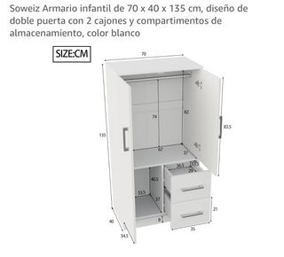 Armario infantil de Soweiz con diseño de doble puerta y compartimentos de almacenamiento. - Medidas: 70 x 40 x 135 cm. - Incluye 2 cajones. - Color blanco.