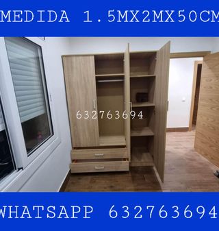 Armario de madera con un diseño moderno y funcional. Sus dimensiones son 1.5 metros de ancho, 2 metros de alto y 50 centímetros de profundidad. Nuevo empaquetado! Hacemos envíos y montajes a domicilio contrareembolso. También nos pueden contactar a través de WhatsApp al 632763694 - Tres puertas. - Dos cajones inferiores.