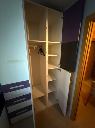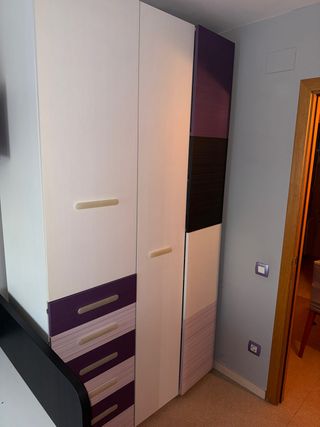 Conjunto de armario y cama de 1 metro por 2 ancho Armario 1,40 metros ancho/ 2,36 metros alto, 56cm fondo Escritorio 2 metros - Armario con puertas y cajones. - Diseño moderno con detalles en morado y blanco. - Acabado en madera y plástico. URGE LLEVARSELO ANTES DEL LUNES 9 DE FEBRERO
