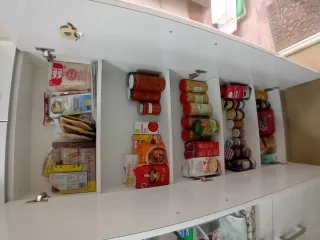 Armario de cocina con un diseño moderno y funcional. Sus acabados combinan blanco y plata para un toque elegante. - Puertas con tiradores integrados. - Amplio espacio de almacenamiento. Alto 2.05 Ancho 75.5 Fondo 22 Parte de arriba 45 4 baldas 4 patas. 2 cm regulable Esta desmontado