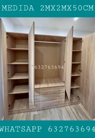 Armario de madera con gran capacidad de almacenamiento. Nuevo, empaquetado! Hacemos envíos y montajes a domicilio CONTRAREEMBOLSO! Atendemos WhatsApp al 632763694 - Medidas: 2 metros de alto, 2 metros de ancho y 50 cm de fondo. - Diseño moderno con puertas abatibles. - Incluye baldas y cajones para organizar tus pertenencias.