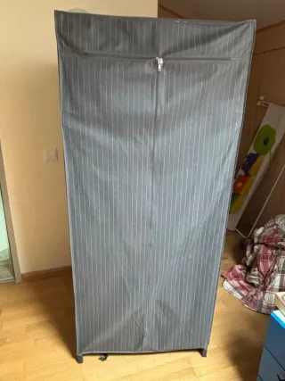 Armario de tela con unas medidas de 1,69 metros de alto, 75 cm de ancho y 50 cm de fondo. Es una solución práctica para organizar tu ropa. - Estructura ligera y fácil de montar. - Cremallera frontal para acceso. - Diseño a rayas verticales. Entrego en mano en Parla.